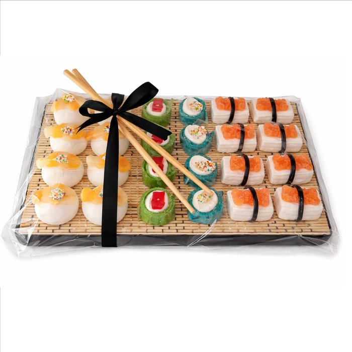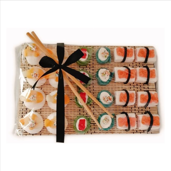 La bandeja de chuches tipo sushi “Susi” es una forma diferente de sorprender. Inspirada en el sushi tradicional, combina golosinas variadas que imitan makis y nigiris, creando una presentación llamativa, equilibrada y muy apetecible.