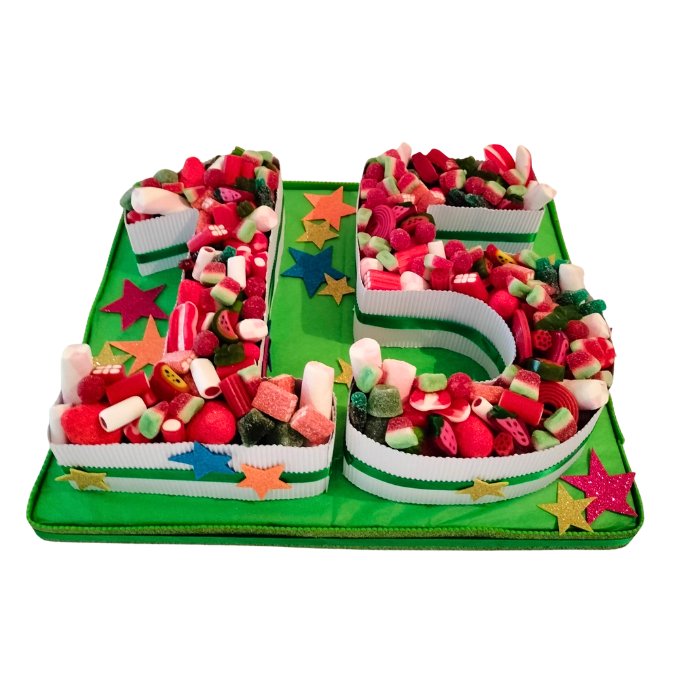 Esta tarta de chuches con forma de número es perfecta para cumpleaños, aniversarios y celebraciones especiales, ya que puedes elegir el número que necesites y convertirlo en el protagonista de la mesa dulce.