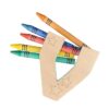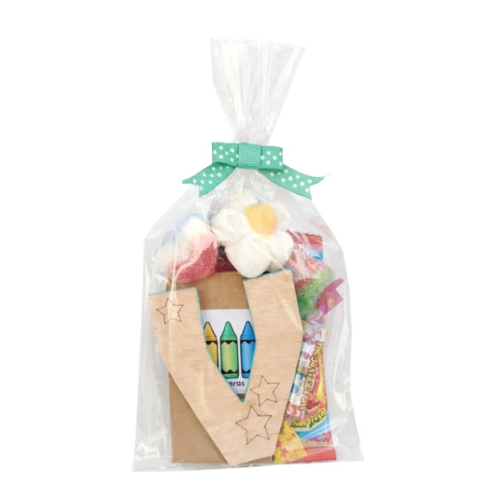 Incluye la letra en madera con dibujo grabado, una cajita de ceras y una selección de golosinas, creando un detalle completo que podrán pintar y disfrutar desde el primer momento.