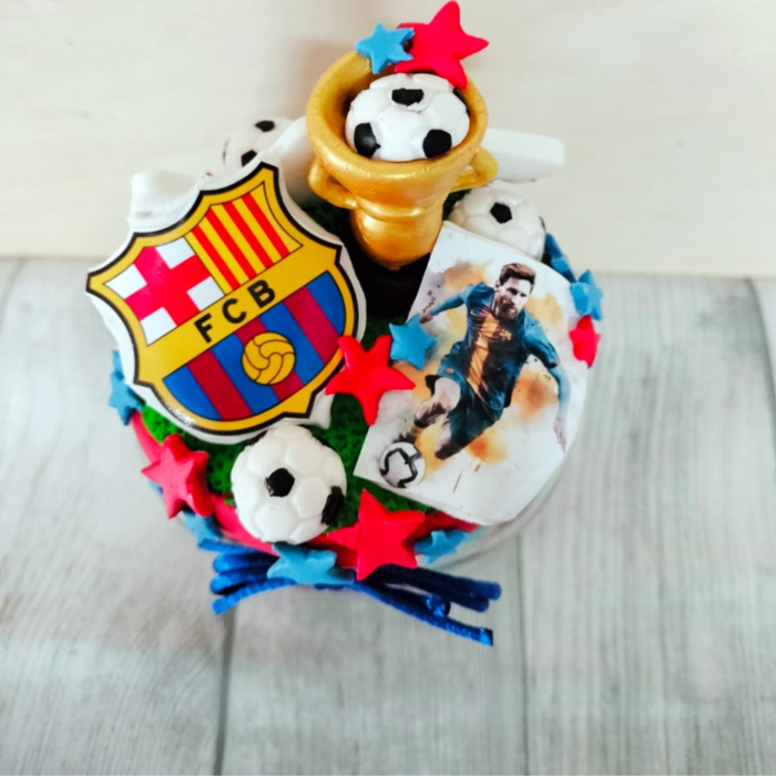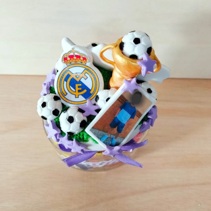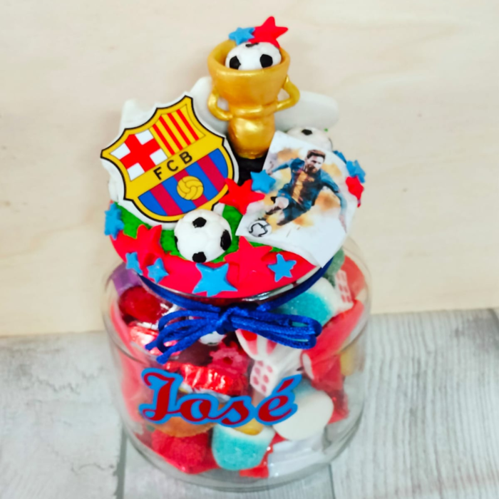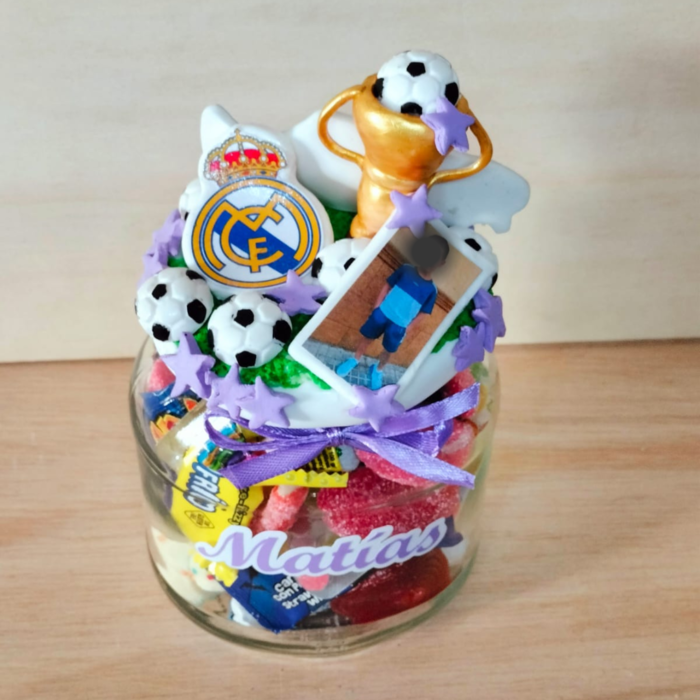 Un bote repleto de golosinas y chocolates, con una capacidad de 700 gramos, decorado con los colores y emblemas de tu equipo. Podemos poner una foto tuya (nos la puedes mandar por WhatsApp o correo electrónico) o de tu jugador preferido. Y por la parte de atrás lleva una bota, que también pintamos con los colores que tus nos indiques, ya pueden ser como las tuyas o como las de tu ídolo. Para que sea súper personal.