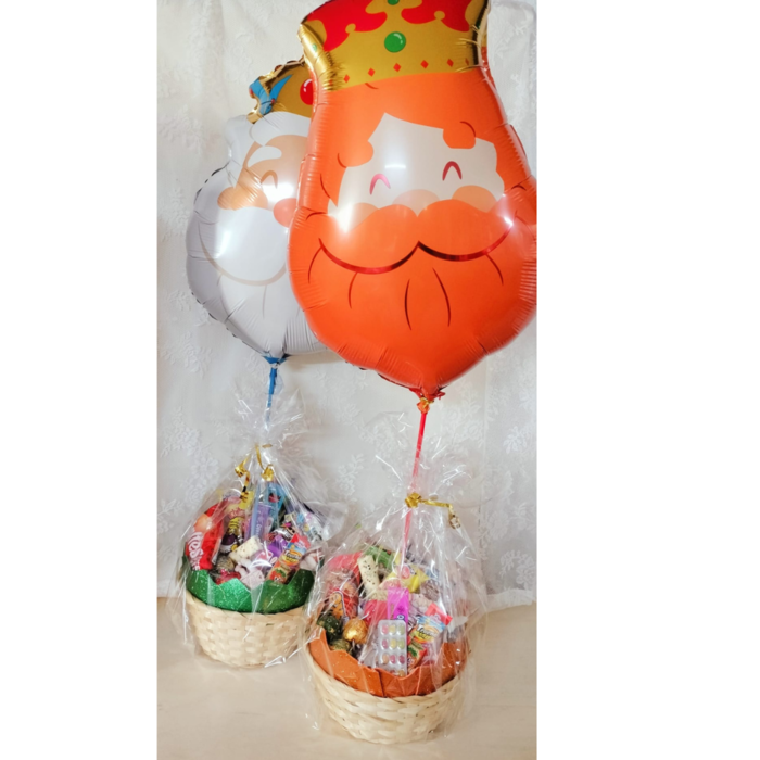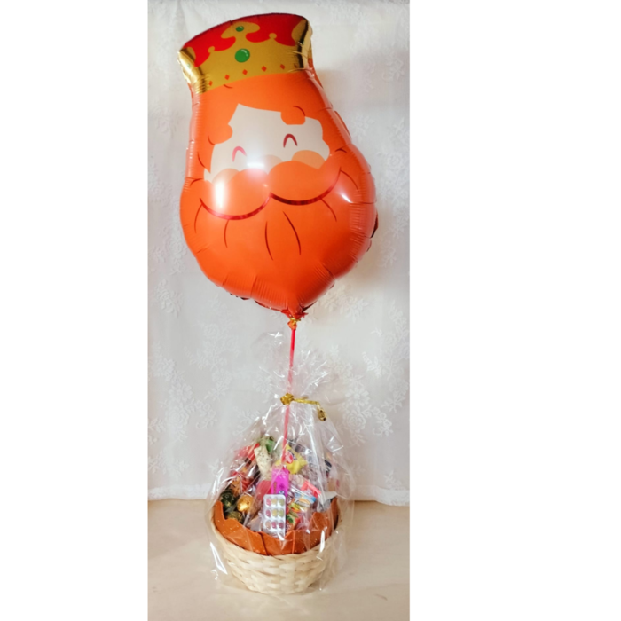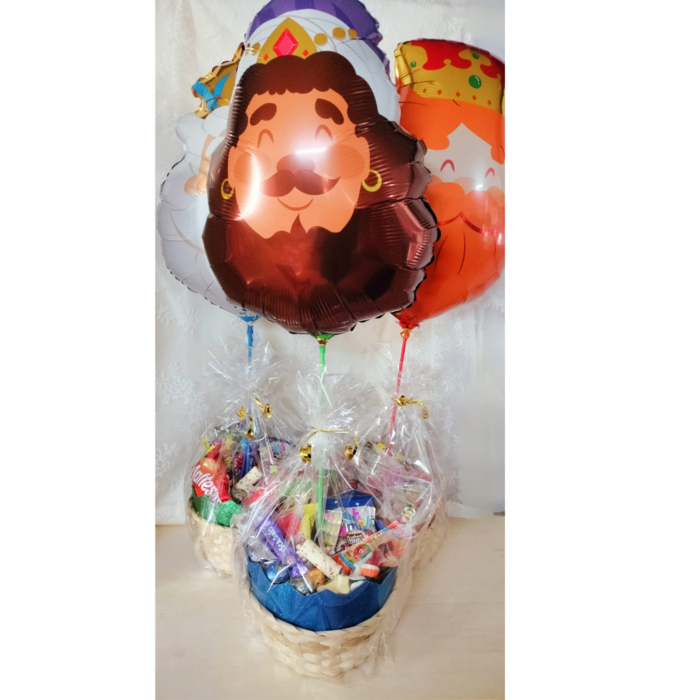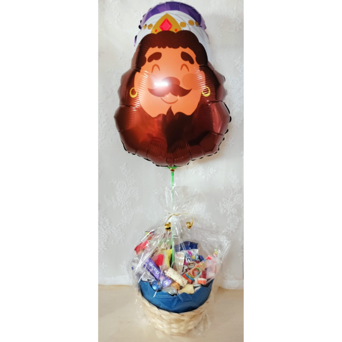 Nuestras cestas de Reyes Magos, van repletas de chuches y chocolates, decoradas con una colorida y brillante corona, y para que sea aun más llamativa le añadimos un globo del Rey Mago que más te guste.