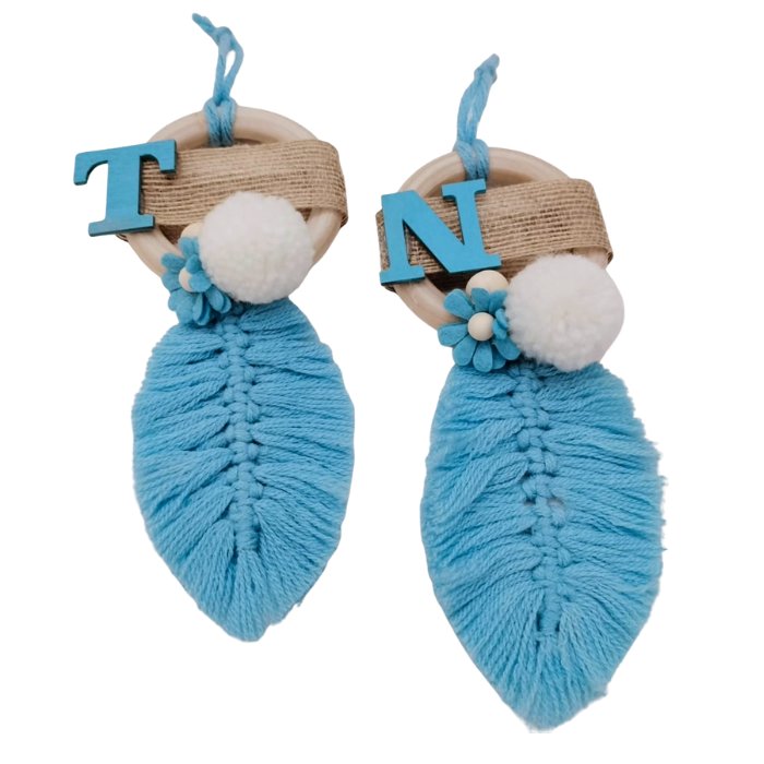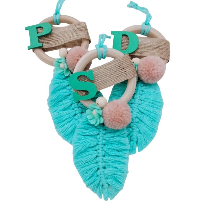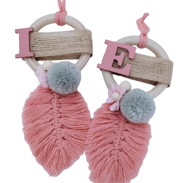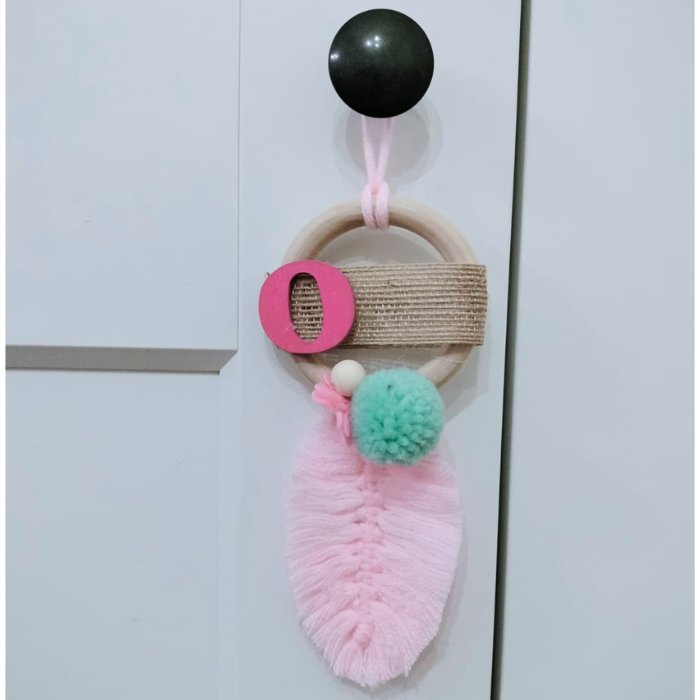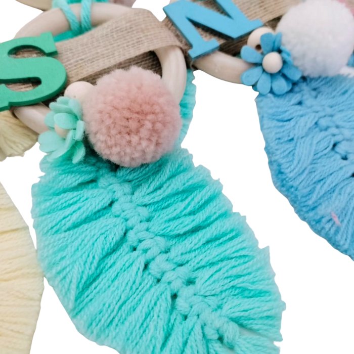 Está realizado a mano con hoja de macramé, aro de madera natural y una letra personalizada, combinado con pompones y pequeños detalles decorativos que le aportan un toque dulce y elegante. Perfecto para colgar en pomos de puertas, tiradores, perchas o como adorno decorativo en cualquier rincón especial ✨