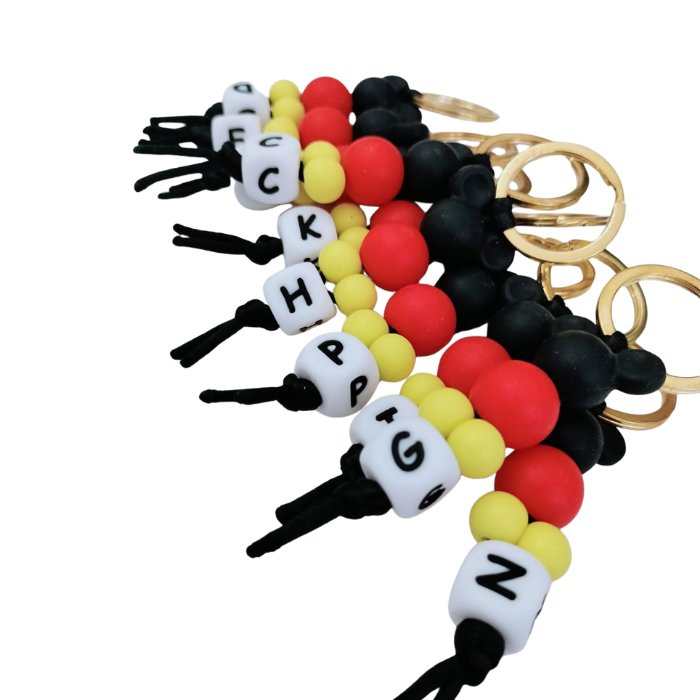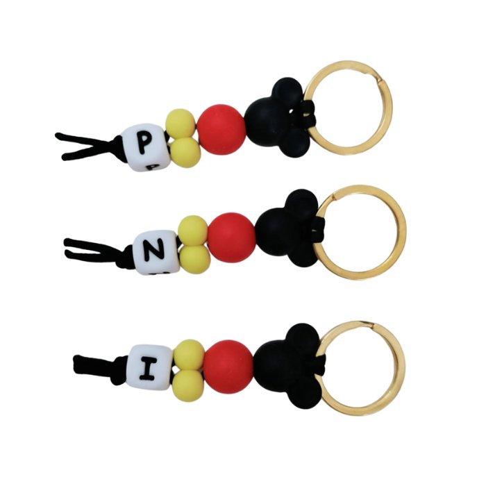 Está hecho a mano con cuentas de silicona en tonos negro, rojo y amarillo, e incluye una letra personalizada para hacerlo todavía más especial. Su diseño alegre y reconocible lo convierte en un detalle práctico y emotivo que encanta desde el primer momento ✨