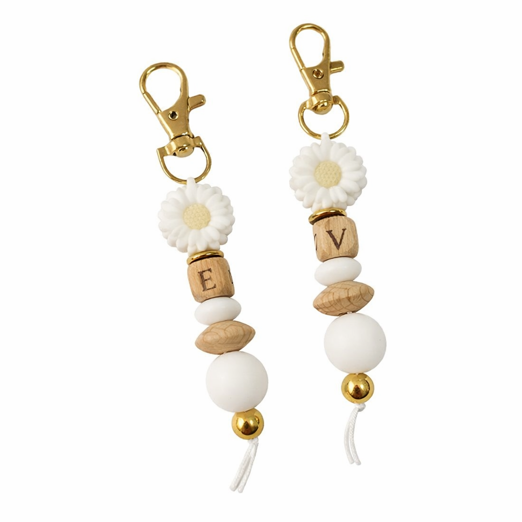 Está hecho a mano con una combinación de cuentas en tonos naturales, flor de margarita y letra personalizada, creando un detalle delicado y muy especial.