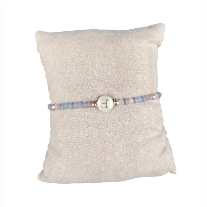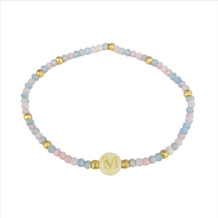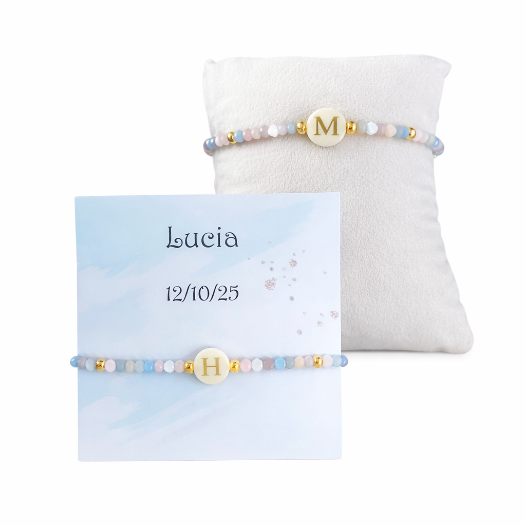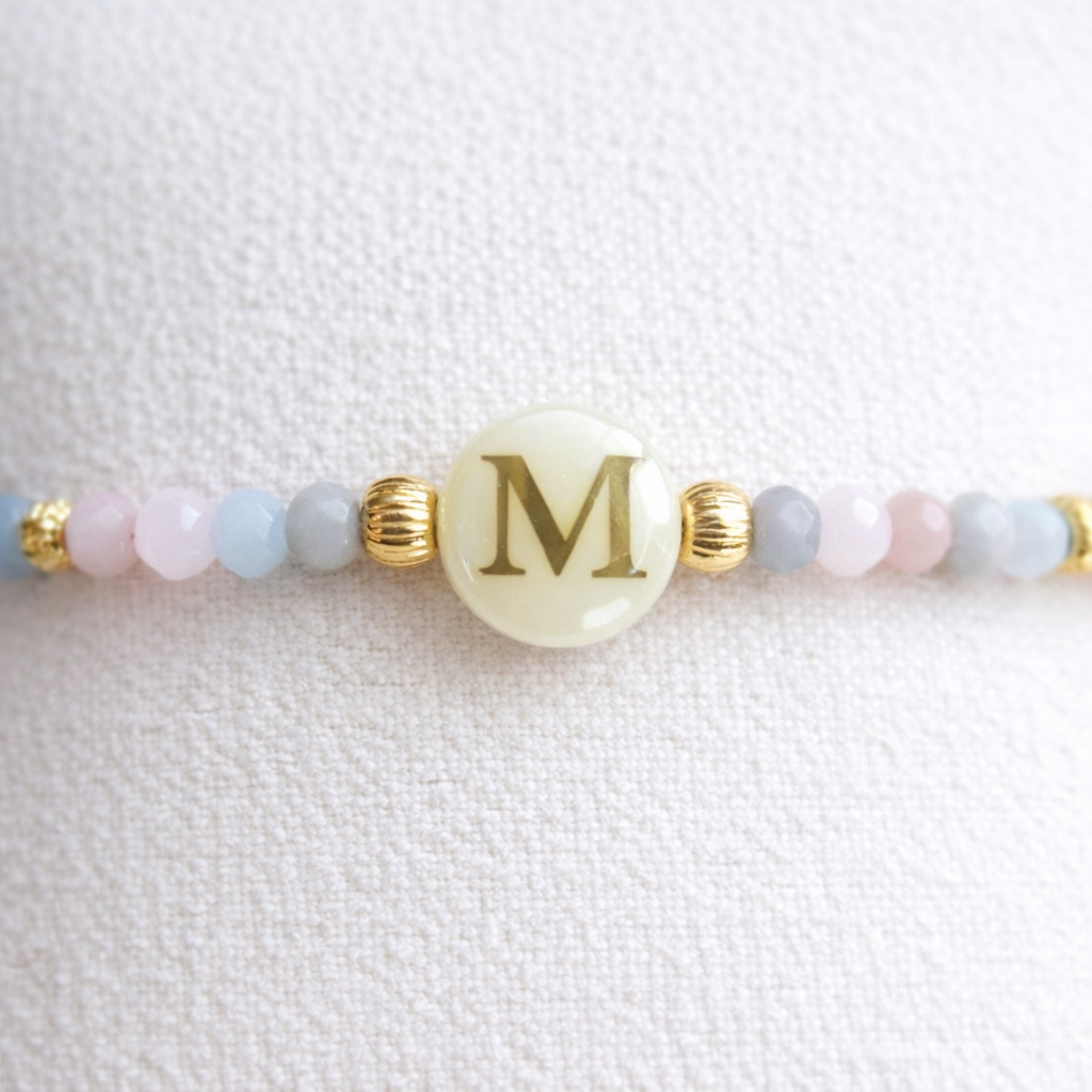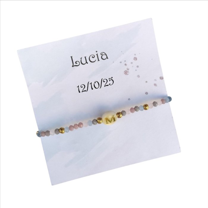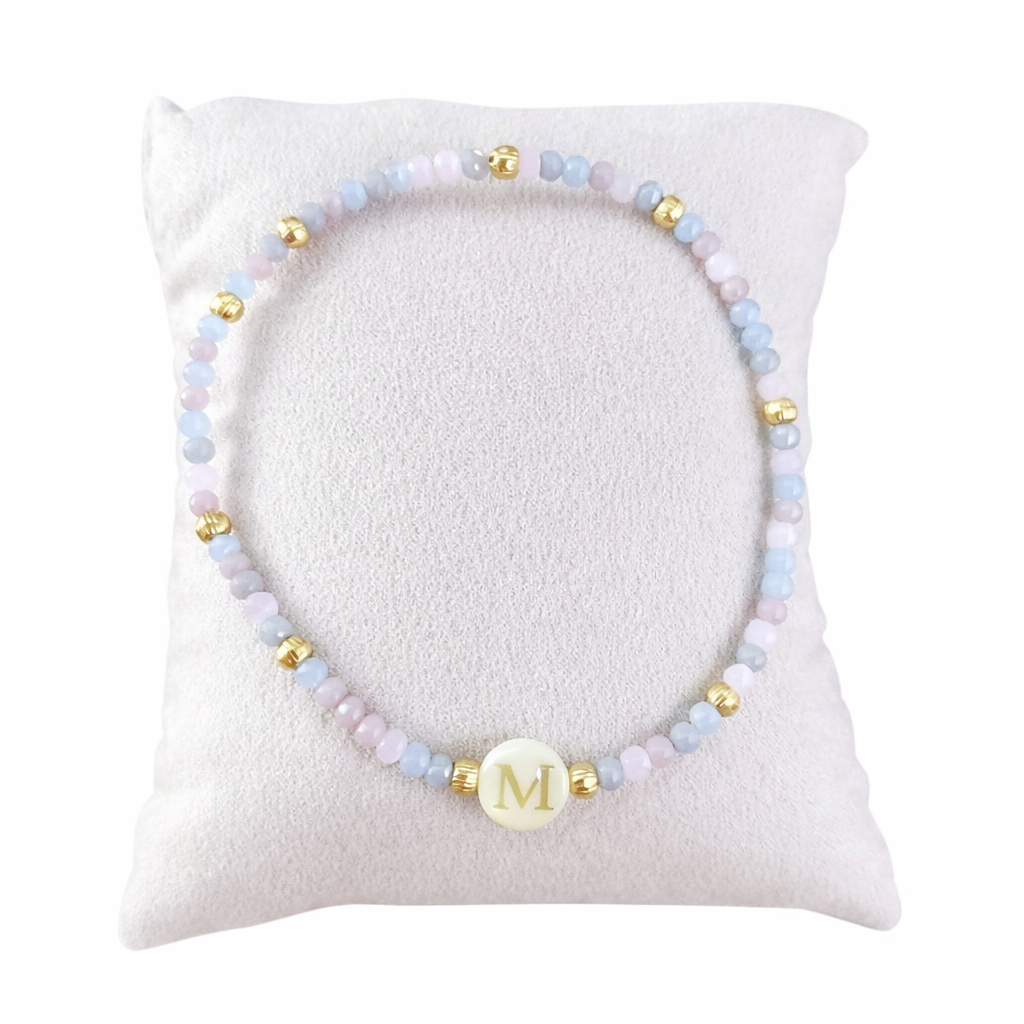 Esta pulsera personalizada con inicial combina cuentas en tonos suaves con detalles dorados, creando un diseño fino, equilibrado y fácil de llevar en cualquier ocasión.