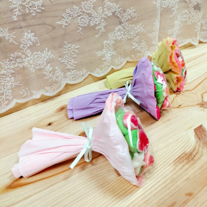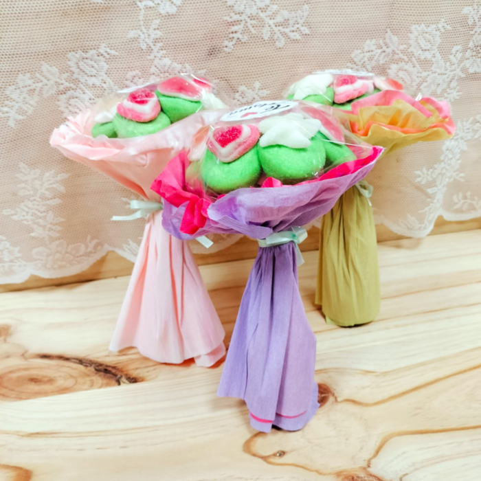 Estos ramos además de estar buenísimos son muy bonitos, empaquetados en papel de crepe en tonos pasteles, para que resalten los colores vibrantes de las chuches .