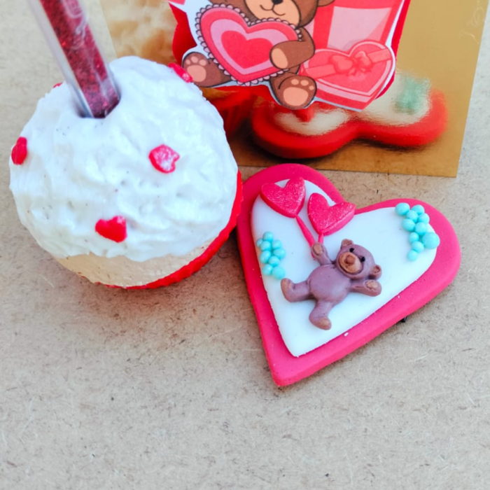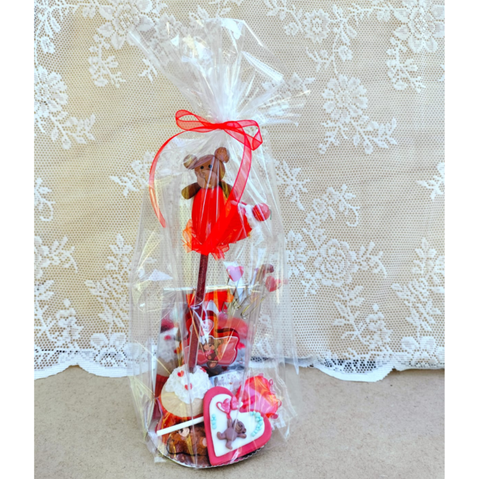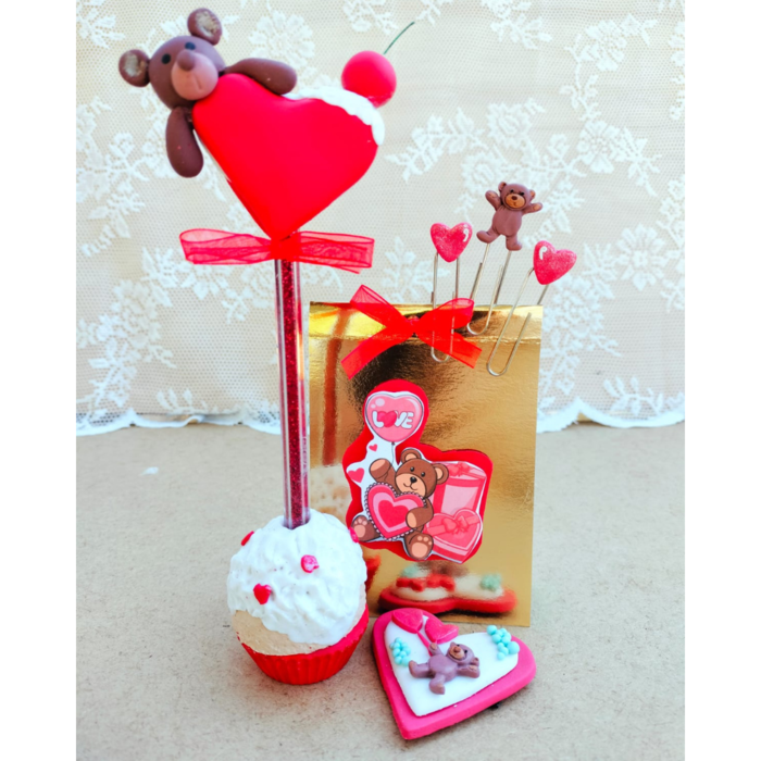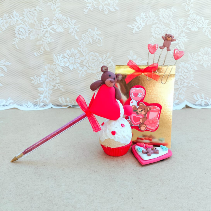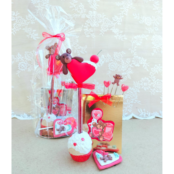 Hecho a mano, en porcelana, bonito, y compuesto por un bolígrafo, tres clips, un imán y una pequeña libretita. Y para que no le falte de nada en el empaquetado le añadimos unos dulces.