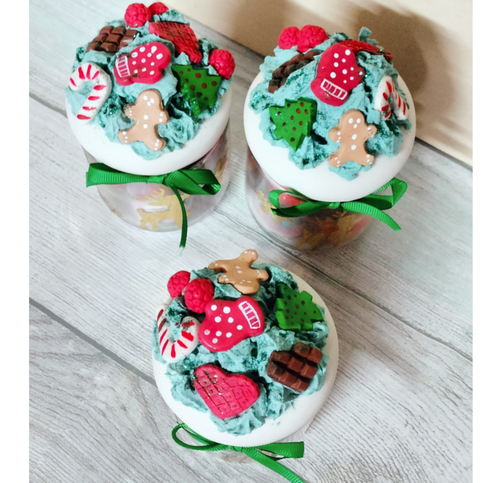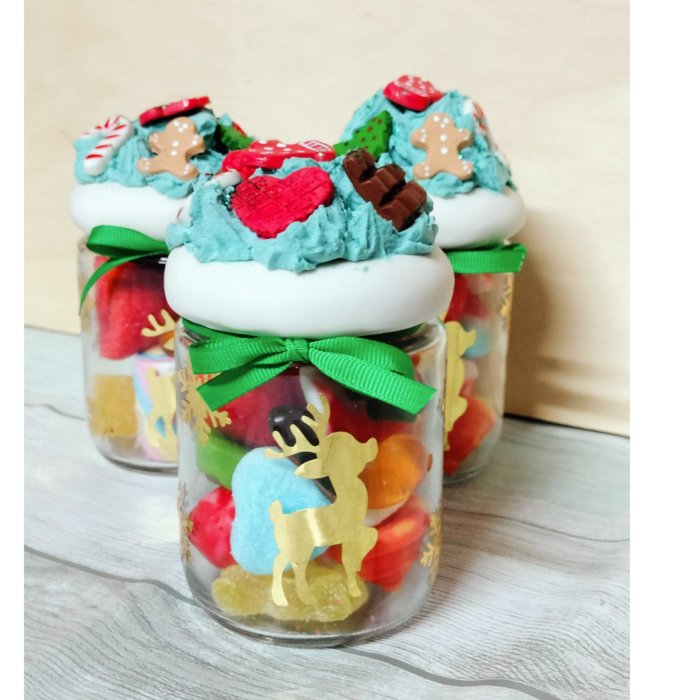 Nos encantan estos tarros, decorados en arcilla, con pequeños motivos navideños, todo hecho a mano, cuidando todos los detalles. Los rellenamos de golosinas y chocolates.