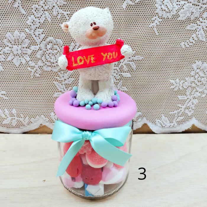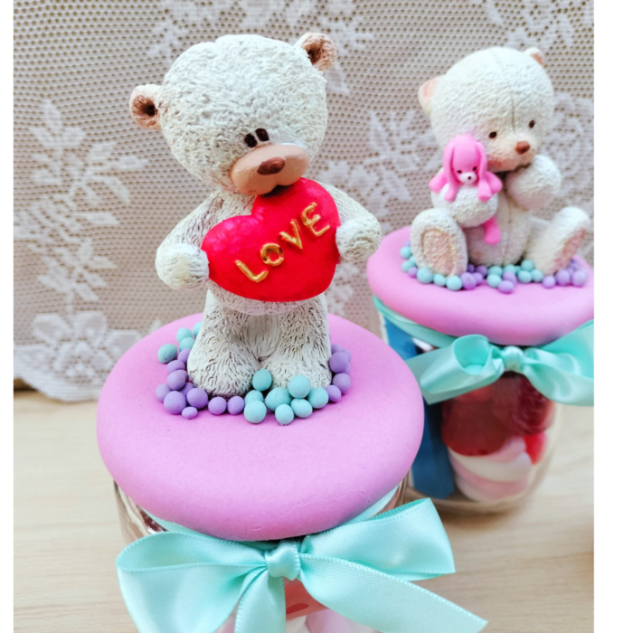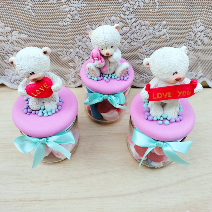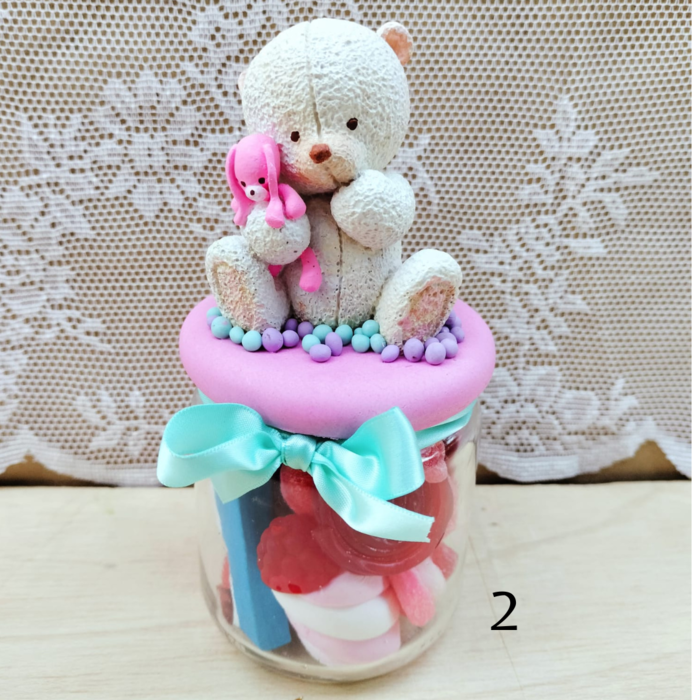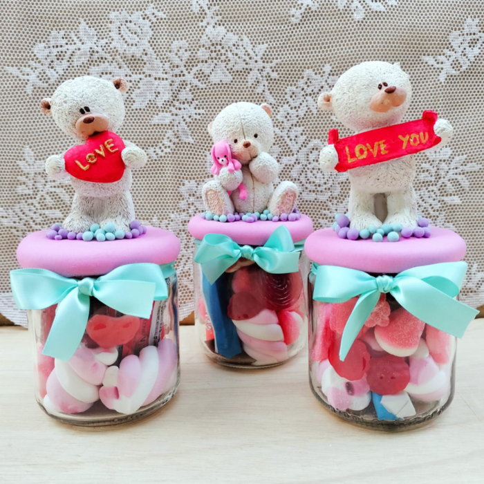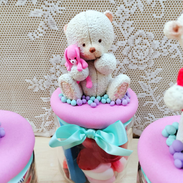 Estos tarritos no pueden ser mas tiernos, con tres modelos de ositos para elegir, en colores suaves y cálidos, rellenos de golosinas y chocolates