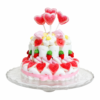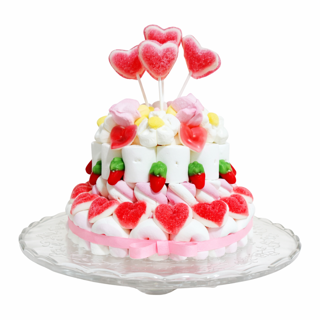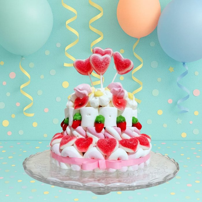 Esta tarta está elaborada de forma artesanal, combinando nubes, corazones y golosinas suaves en tonos rosados y blancos, creando una composición alegre, equilibrada y muy apetecible.