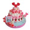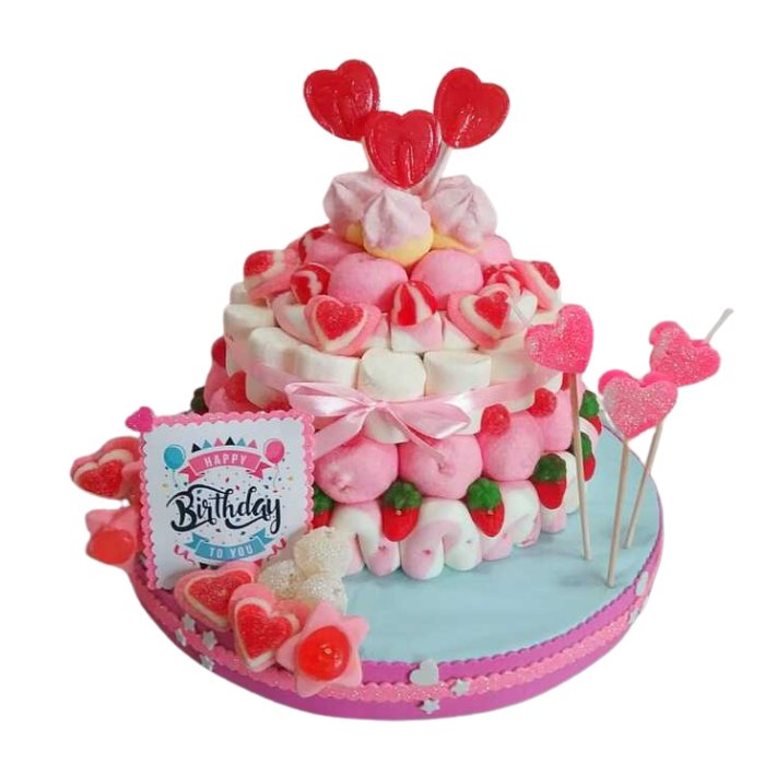 Nuestra tarta de chuches Sweet Love es pura dulzura hecha arte: corazones rojos, nubes esponjosas y un toque de brillo que la hace perfecta para cumpleaños, aniversarios, sorpresas románticas o fiestas llenas de cariño y risas.