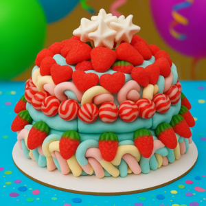 Este delicioso tarta está hecha con coloridas chuches, creando una combinación perfecta de sabores y texturas. Su aspecto vibrante y atractivo la convierten en el centro de atención en cualquier celebración. Ideal para cumpleaños, fiestas o simplemente para disfrutar en casa, cada bocado es una explosión de dulzura que encantará a grandes y pequeños. ¡No te lo puedes perder!