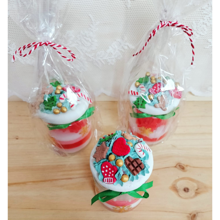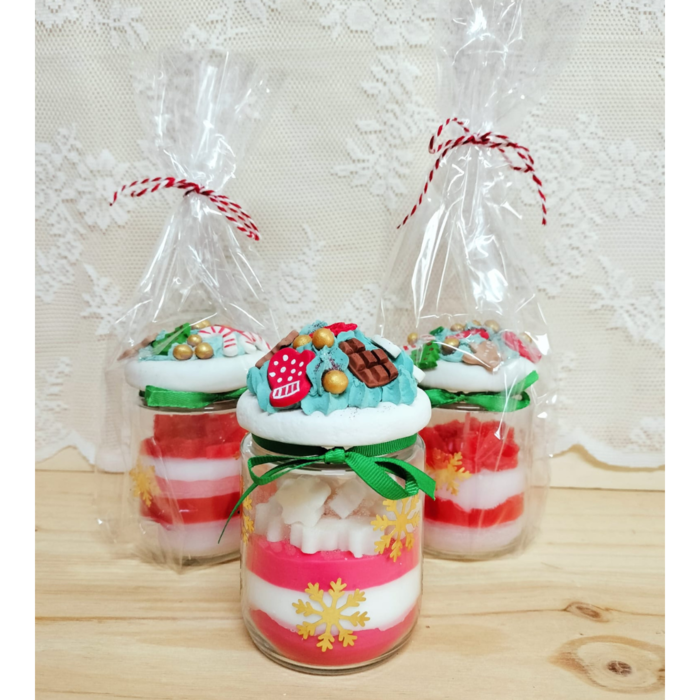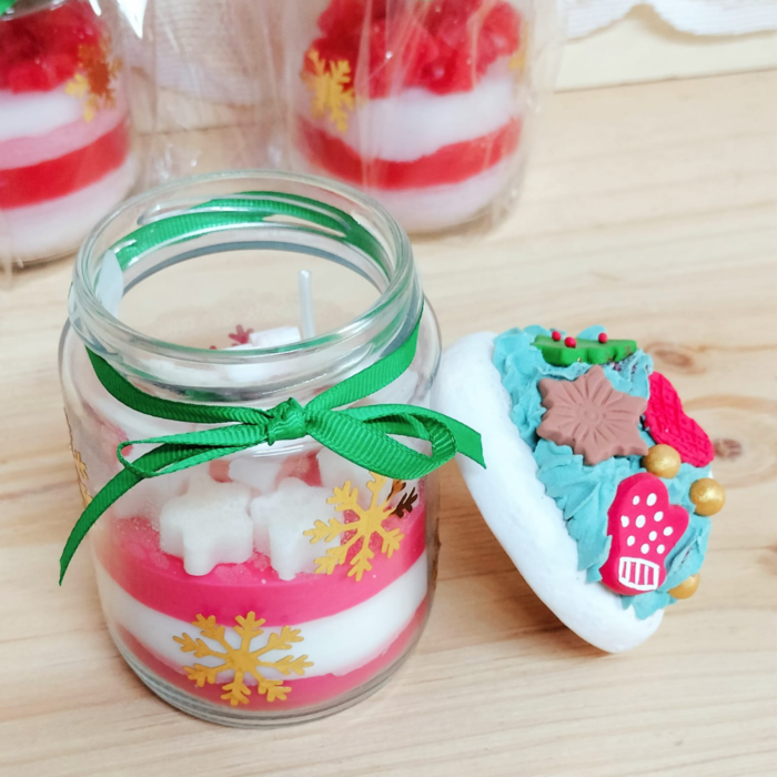 Nos encantan estas velas, el tarrito esta decorado con arcilla, con pequeños motivos navideños, todo hecho a mano, cuidando todos los detalles.