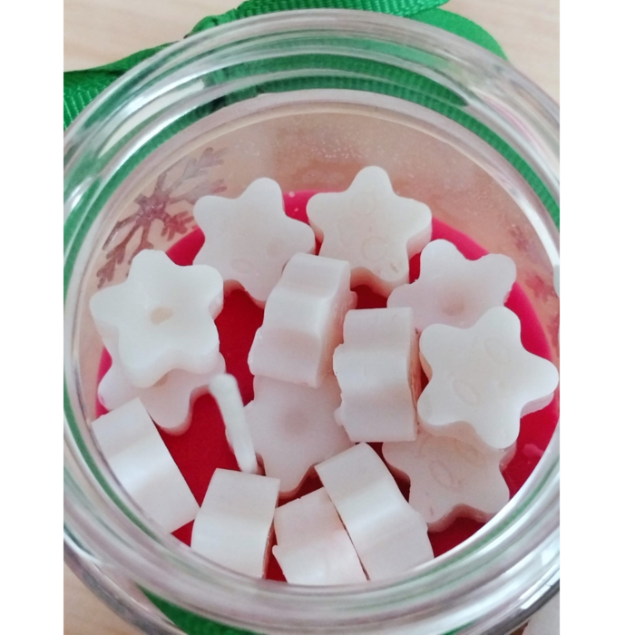 La vela hecha en color rojo y blanco, con aroma a Piruleta, llena de pequeñas estrellitas que le dan un toque muy navideño.
